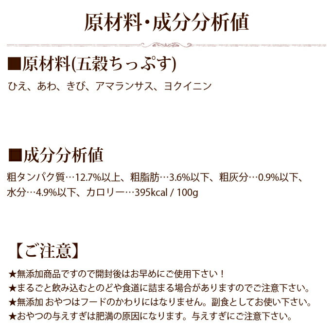 ■ 配送目安 ■ 会社概要 ■ お支払いと送料について T.Houndcom.トリーツシリーズ ■内容量:50g ◆原材料◆ひえ、あわ、きび、アマランサス、ヨクイニン ◆保証分析値◆●395kcal /100g 【ご注意】★