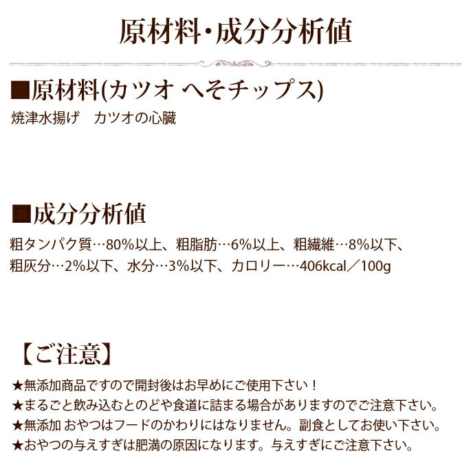 《与え方もいろいろ》 おやつとしてそのまま与える 普段食へトッピング 手作り食の材料 ●ドットわんカツオへそチップス【無添加・犬おやつ】65g ●原材料名:焼津水揚げ カツオの心臓 ●内容量:65g ●生産地:静岡県焼津市 ●成分:成分 粗タンパク質…80%以上 粗脂肪…6%以上 粗繊維…8%以下 粗灰分…2%以下 水分…3%以下 ●カロリー:406kcal/100gあたり ●賞味期限:製造日より1年 ドットわんカツオ へそチップス【無添加・犬おやつ】65g 犬 手作り食【無添加ドッグフード】【ドックフード 無添加 ペットフード ペット用品 グッズ ご飯 犬のおやつ オヤツ ペット用 ドック いぬ イヌ ドッグ 】