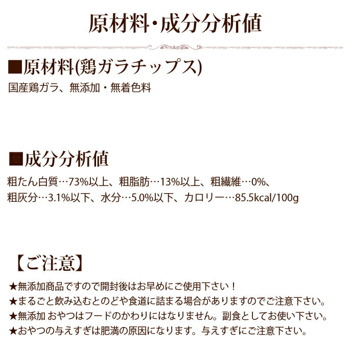 ◆内容量◆ 35g(乾燥前約71g) ◆原材料◆ 国産鶏ガラ、無添加・無着色料 *鶏ガラ・・・鶏ガラに含まれている栄養分はビタミンA・ビタミンB1・ビタミンB2、ビタミンKなどのビタミン類に、コラーゲンや鉄分やオレイン酸といった栄養素が挙げられます。