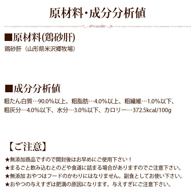 ●商品名:ドットわんチップス鶏砂肝【無添加・国産自然食ドッグフード】50g ●原材料名:鶏砂肝(山形県米沢郷牧場) ●内容量:50g(加工前なま砂肝208g) ●成分:粗たん白質…90.0%以上 粗脂肪…4.0%以上 粗繊維…1.0%以下 粗灰分…4.0%以下 水分…3.0%以下 ●カロリー:372.5kcal/100gあたり ●賞味期限:製造日より6カ月 ドットわんについて