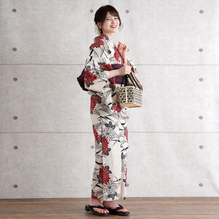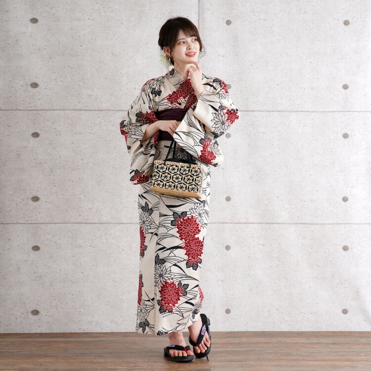 浴衣 セット レディース 浴衣 3点セット(浴衣/帯/下駄)先染めベージュ 赤 えんじ 菊 きく 露芝 古典柄 注染 手染め 本染め 伝統工芸 日本製 国産 アンティーク図案 1930年〜1940年代  浴衣セット ゆかた 女性 レトロ フリーサイズ