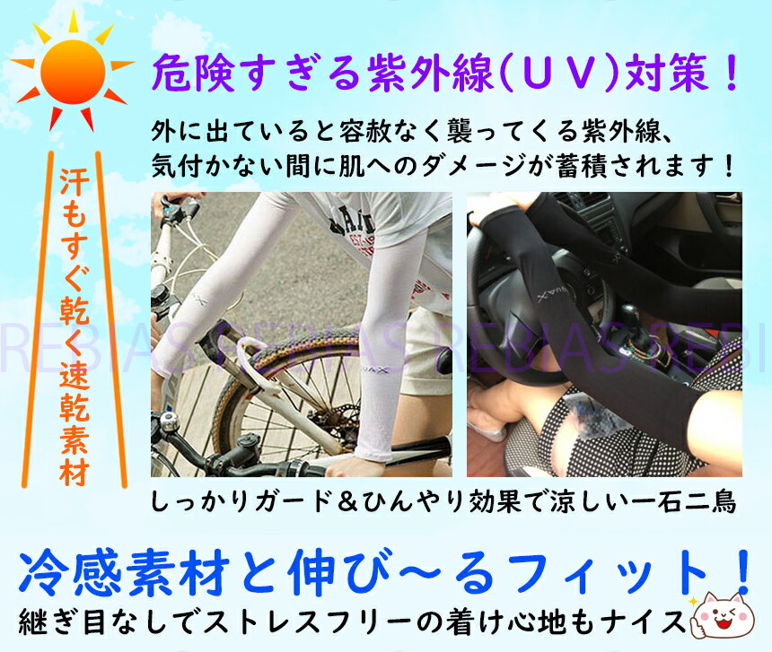■商品説明 暑い夏やスポーツにマストなアイテム!ひんやり冷たい肌触り!伸縮性も抜群!「クールアームカバー」UVカット素材で強い日差しの紫外線(UV)対策に!サラサラひんやり冷感素材で涼しい!汗をかいてもすぐ乾く速乾性も抜群!継ぎ目なしだから痛くならないストレスフリー!伸び〜る素材で男女兼用フリーサイズ!選べるコーディネイトに嬉しい全7色!※類似品にご注意ください(見た目での判断は難しいです)。